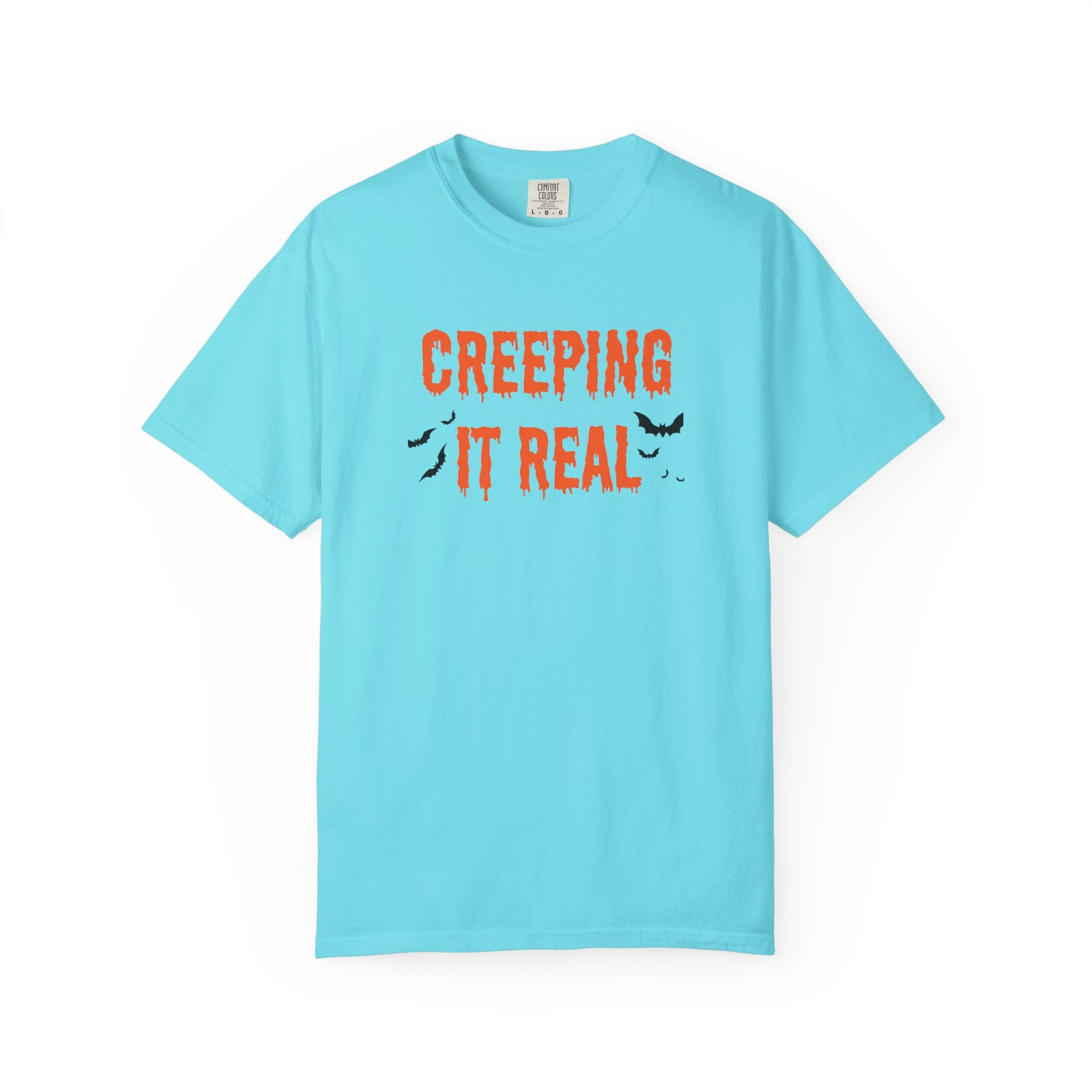 The Creeping it Real T-shirt is perfect for those who love a spooky and fun atmosphere. It's a relaxed fit garment-dyed tee that is ideal for Halloween enthusiasts and horror movie fans. This t-shirt can be worn casually or as part of a costume for Halloween parties and events.