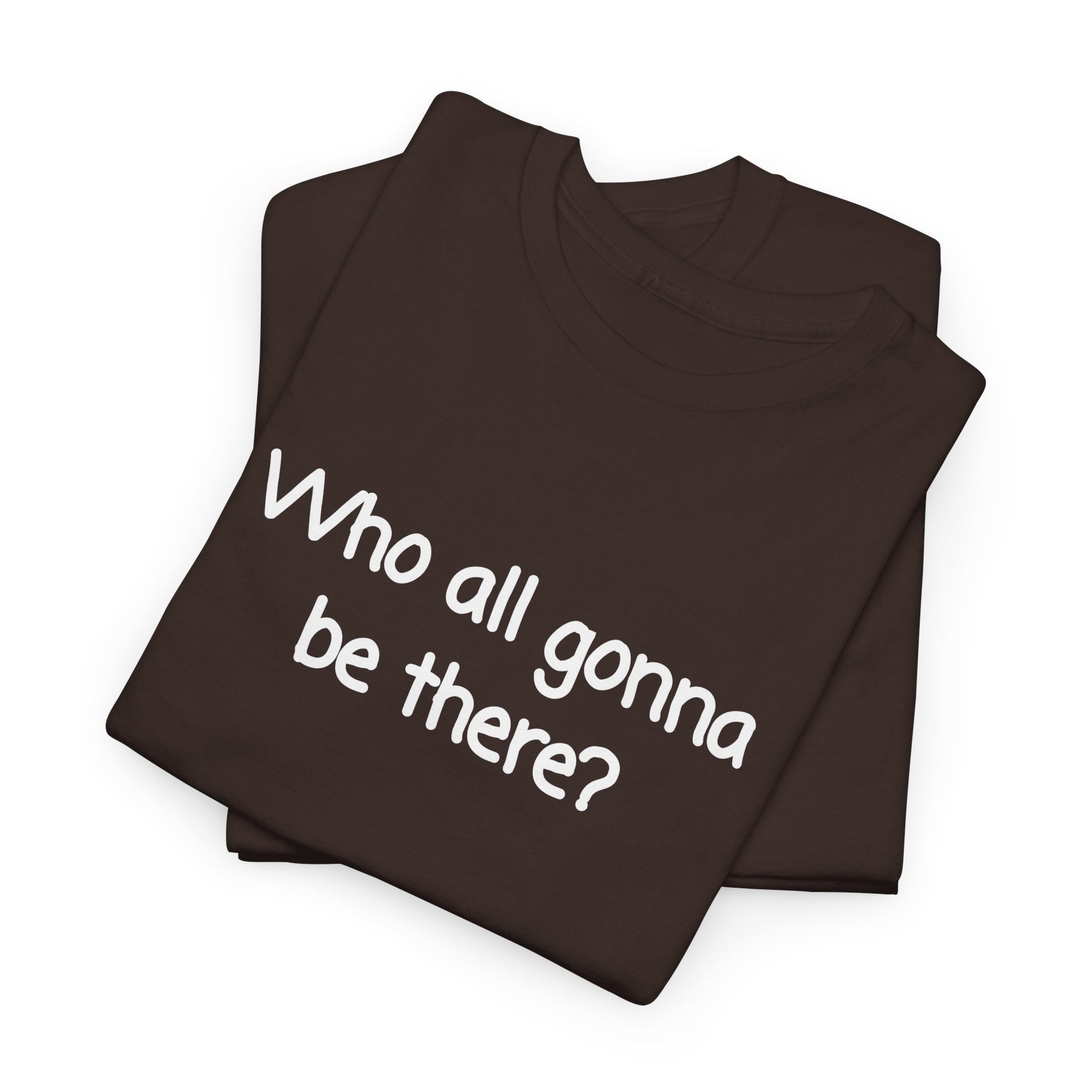 This tee features a simple 'Who all gonna be there' design, giving off a laid-back and casual vibe. Perfect for those who enjoy fun and light-hearted gatherings with friends and family as well as the more introverted among us. Ideal for everyday wear, social events, and casual hangouts.